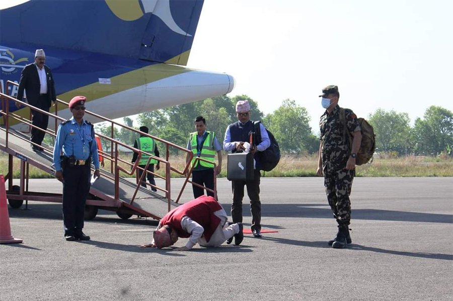 काठमाडौं – उपप्रधान एवम् रक्षामन्त्री भएपछि पहिलो पटक गृह जिल्ला सुर्खेत पुगेका पूर्णबहादुर खड्काले सुर्खेत विमानस्थलमा जहाजबाट ओलर्ने बित्तिकै माटोलाई ढोगेका छन् ।