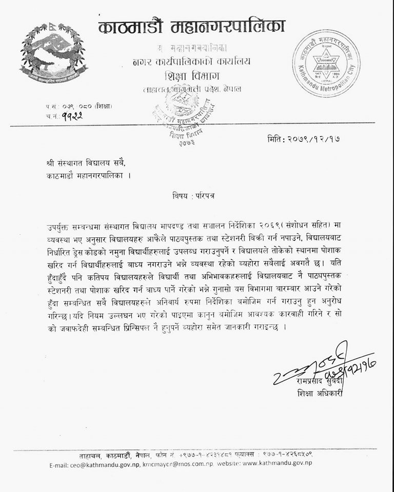 ‘विद्यालय आफैंले किताब बेच्ने गरेको र पोसाकसमेत सम्बन्धित ठाउँबाट नै किन्नु भनेर अभिभावकलाई बाध्य गराएको गुनासो पटक-पटक आइरहेको छ,’ मेयर शाहले भने । यस्तो कार्य संस्थागत विद्यालय मापदण्ड तथा सञ्चालन निर्देशिका २०६९ अनुसार दण्डनीय भएको उनले स्मरण गराएका छन् ।