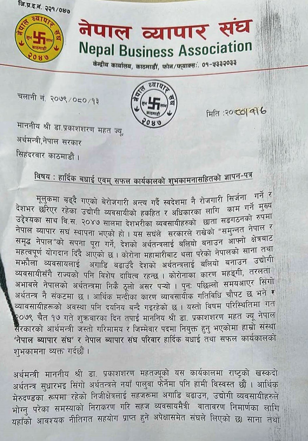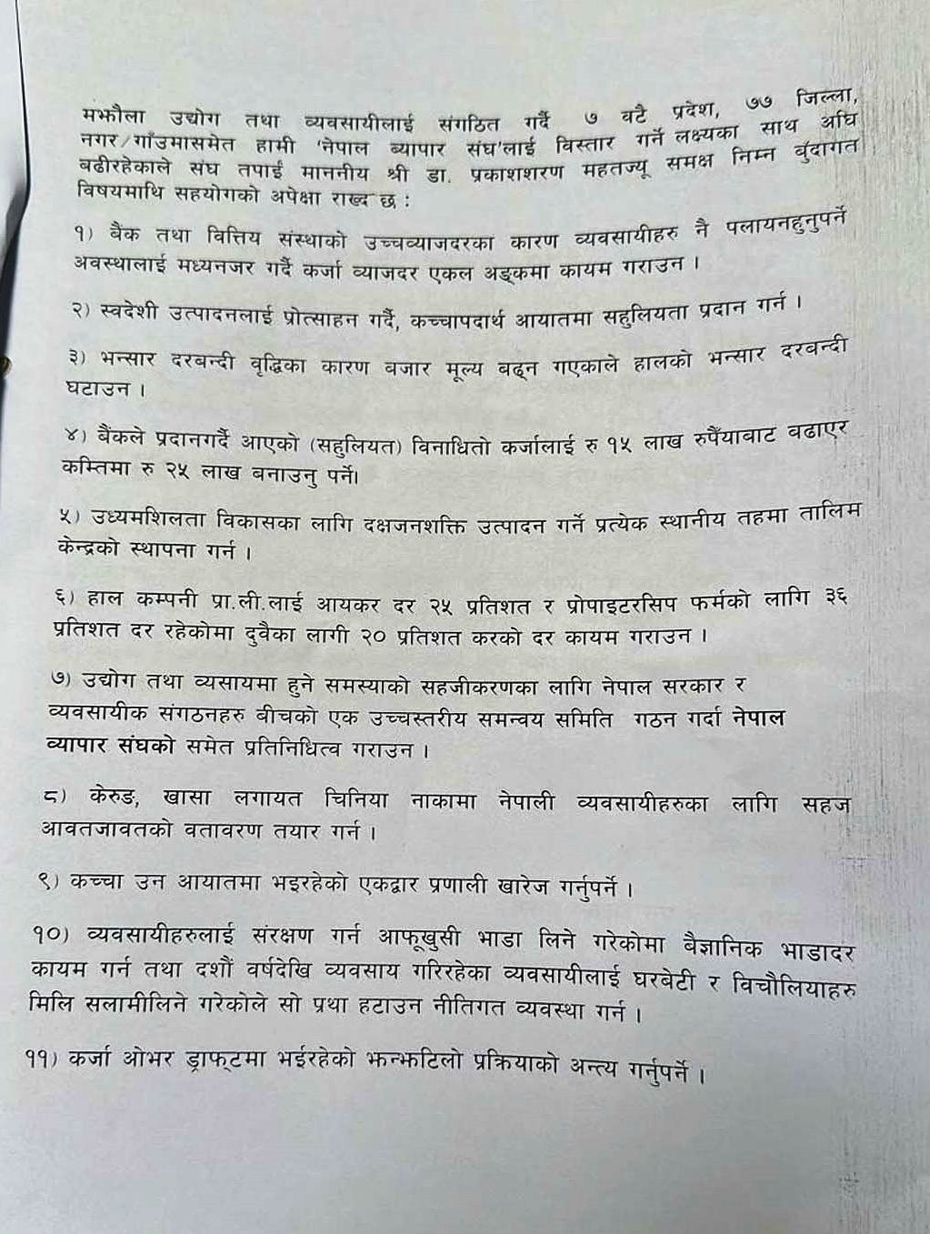 राष्ट्रको खस्कदो अर्थतन्त्र सुधार भइ सिंगो अर्थतन्त्रले नयाँ पालुवा फेर्नेमा आफुहरु विश्वस्त रहेको र आर्थिक मेरुदण्डका रूपमा रहेको निजीक्षेत्रलाई सहजरूमा अगाडी बढाउन, उद्योगी व्यवसायीहरुले भोग्नु परेका समस्याको निराकरण गरि सहज व्यवसायमैत्री वातावरण निमार्णका लागि आवश्यक नीतिगत सहयोग प्राप्त हुने अपेक्षा सहितका कुराहरु समावेश गरि ज्ञापनपत्र बुझाएका हुन् ।