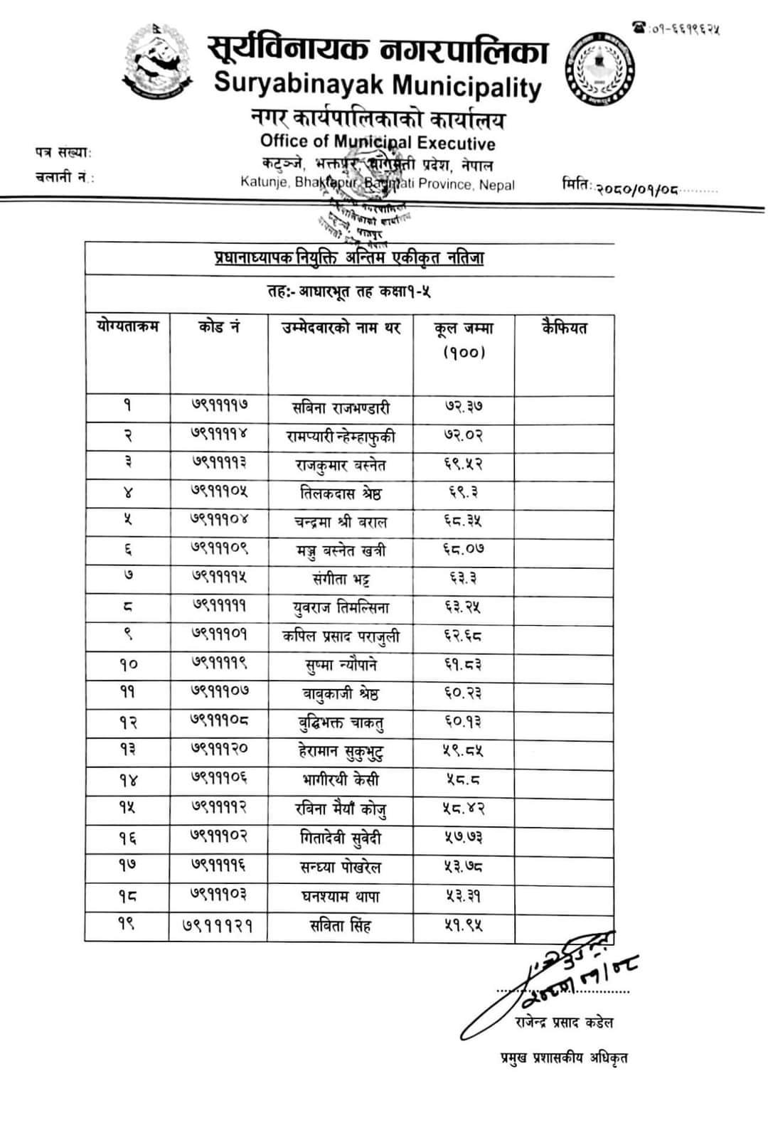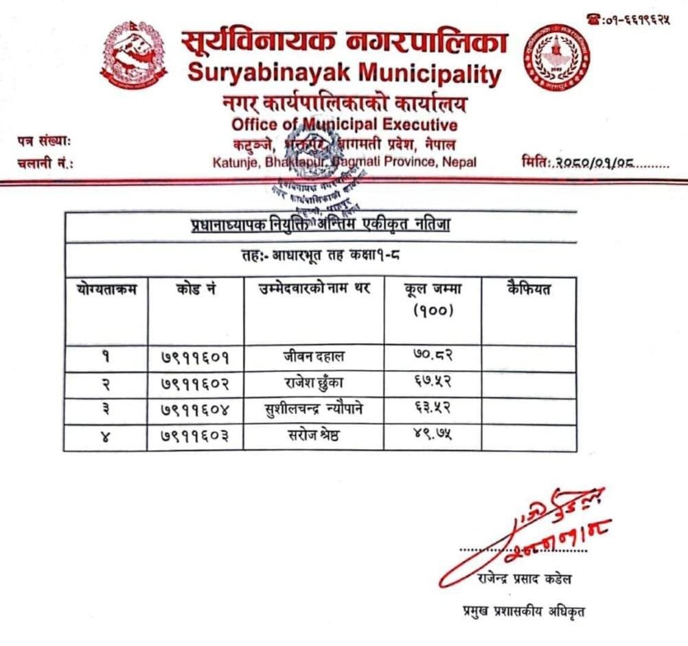 प्रा. डा. मनप्रसाद वाग्ले, प्रा. डा. विनय कुमार कुसियत, प्रा. डा. सुशन आचार्य, प्रा. डा.प्रमिला राजभण्डारी, डा. बिष्णु कार्कीले खुल्ला प्रतिष्पर्धाबाट छनोट गरी अन्तिम नतिजा नगरपालिकाले बुझाएको हो । उनीलाई विज्ञ टोलीमा राखिएकोग थियो । नगर प्रमुख बासुदेव थापा समक्ष नतिजा बुझाएपछि नगरपालिकाले ३२ जना प्रधानाध्यापक पाएको सूचना जारी गर्दे उल्लेख गरेको छ ।
