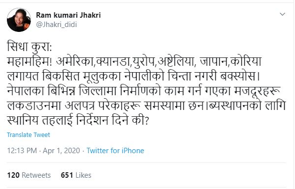 उनले लकडाउनका कारण देश भित्र नै नागरिकको बेहाल भएका बेला विकसित देशमा रहेकाहरुको धेरै चिन्ता आवश्यक नरहेको उल्लेख गरेकी छन् । सामाजिक संजाल ट्विटर मा झाँक्रीले लेखेकी छन् ’महामहिम! अमेरिका, क्यानाडा, युरोप, अष्टेलिया, जापान, कोरिया लगायत विकसित मुलुकका नेपालीको चिन्ता नगरी बक्स्योस’, उनले कटाक्ष गर्दै भनेकी छन्, ’नेपालका विभिन्‍न जिल्लामा निर्माणका काममा गएका मजदुरहरु लकडाउनमा अलपत्र परेर समस्यामा छन् । व्यवस्थापनका लागि स्थानीय तहलाई निर्देशन दिने की?’