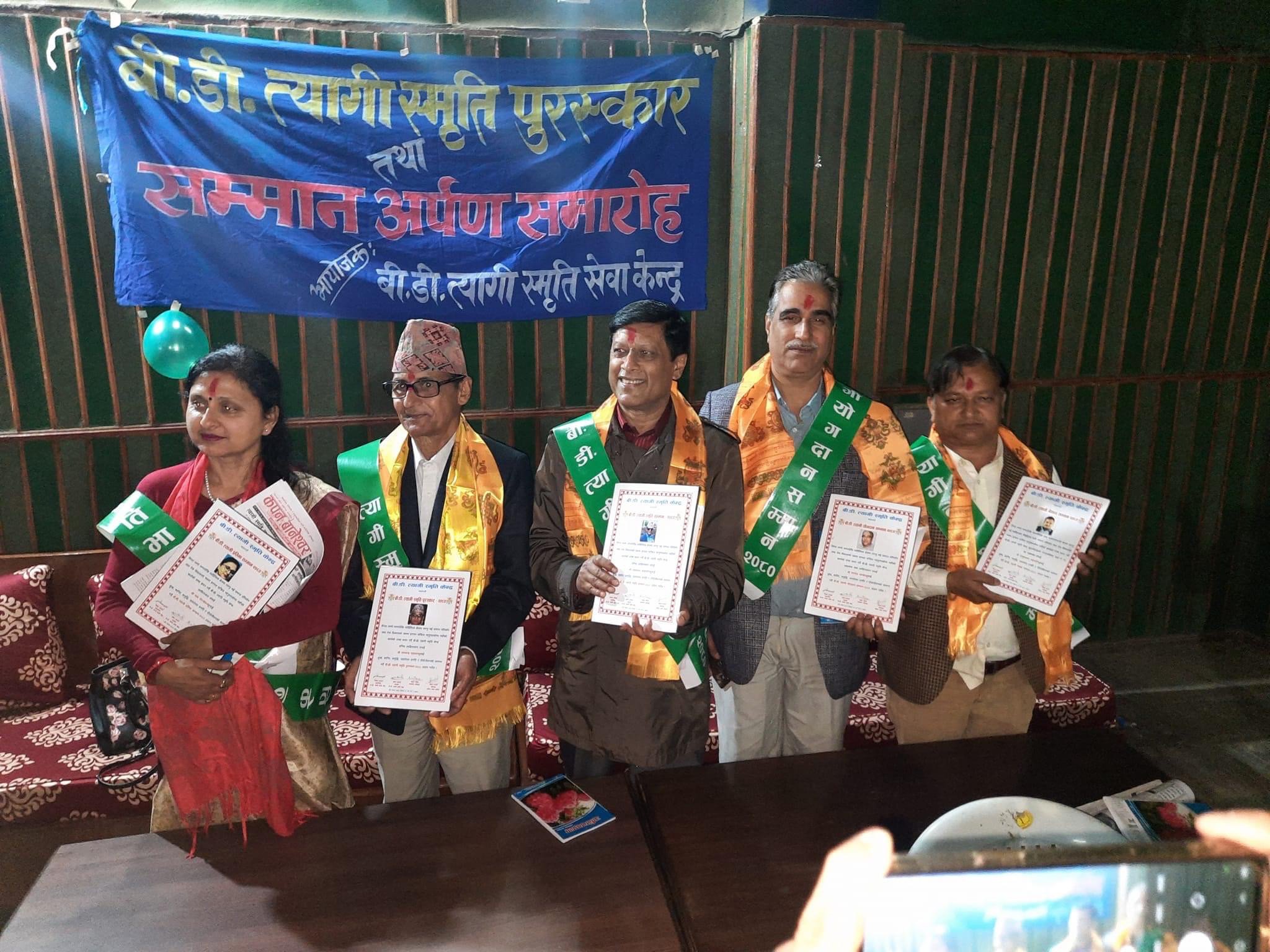 “बीडी त्यागी स्मृति सम्मानबाट बरिष्ठ साहित्यकार राधेश्याम लेकाली,’’बी.डी. त्यागी स्मृति पुरस्कारबाट’’ साहित्यकार रामचन्द्र दाहाललाइ प्रदान गरिनुका साथै , “बीडी त्यागी सम्मान” बाट प्रकाशक तथा साहित्यकार रामदेव पाण्डे,“बीडी प्रतिभा सम्मान”पुरस्कारबाट युवा साहित्यकार सरु पोखरेललाई र गैरसाहित्यिक व्यक्तित्वलाई दिइने नेपथ्य सम्मान बुढानिलकण्ठ नगरपालिका १२ नम्बर वडाका वडाध्यक्ष शम्भु भट्टराईलाई प्रदान गरिएको छ ।२० बर्ष देखि बीडी त्यागी स्मृति दिवसको अवशर पारेर नियमित रुपमा प्रदान गरिने उक्त पुरस्कार र सम्मान हालसम्म सयौं साहित्यकार हरुले प्राप्त गरिसकेको जनाइएको छ ।
