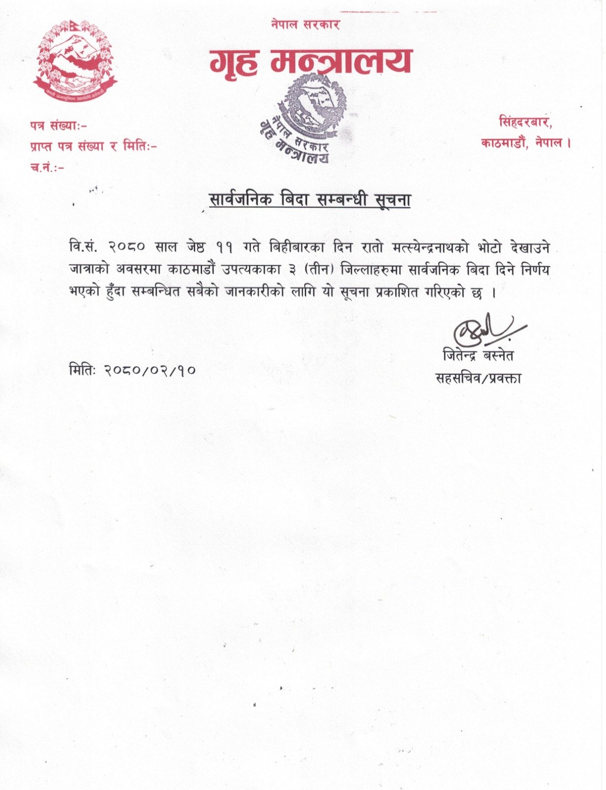 गृह मन्त्रालयले बुधबार एक विज्ञप्ति जारी गर्दै रातो मत्स्यन्द्रनाथको भोटो देखाउने दिनका अवसरमा उपत्यकाका तीन जिल्ला (काठमाडौं, ललितपुर र भक्तपुर) मा विदा दिइएको जनाएको छ।