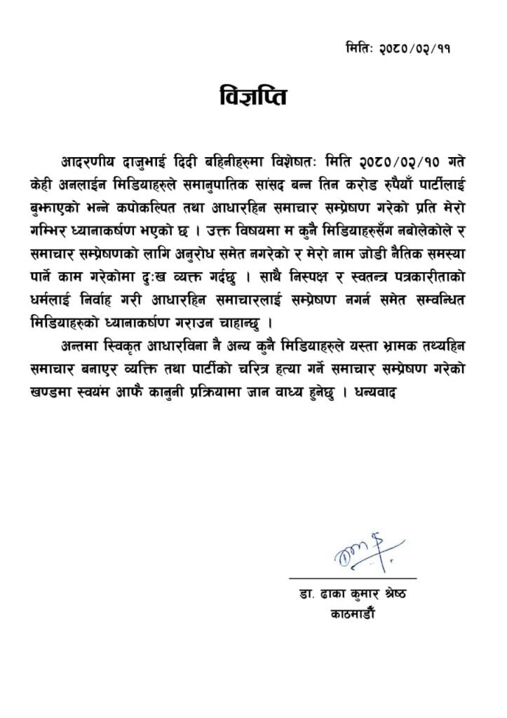 ‘२०८० / ०२ / १० गते केही अनलाईन मिडियाहरुले समानुपातिक सांसद बन्न तीन करोड रुपैयाँ पार्टीलाई बुझाएको भन्ने कपोकल्पित तथा आधारहिन समाचार सम्प्रेषण गरेको प्रति मेरो गम्भीर ध्यानाकर्षण भएको छ । उक्त विषयमा म कुनै मिडियाहरूसँग नबोलेकोले र समाचार सम्प्रेषणको लागि अनुरोध समेत नगरेको र मेरो नाम जोडी नैतिक समस्या पार्ने काम गरेकोमा दुःख व्यक्त गर्दछु’, श्रेष्ठले लेखेका छन् ।
