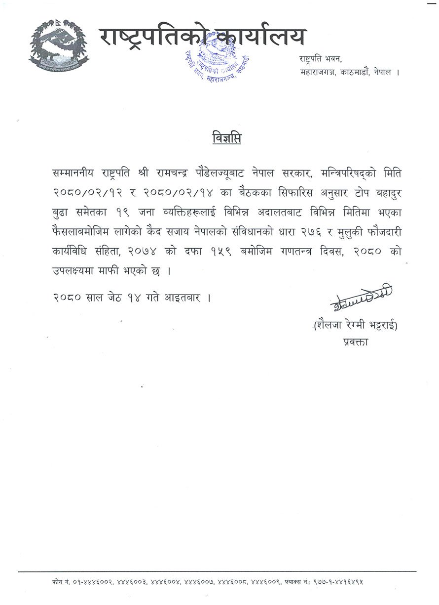 यस्तै ७ जना जेष्ठ नागरिकसहित ४८२ जनाको बाँकी कैद सजाय माफी भएको छ । संविधानको धारा २७६ र फौजदारी कसुुर (सजाय निर्धारण तथा कार्यान्वयन) ऐनको दफा ३७ तथा जेष्ठ नागरिक ऐनको दफा १२ बमोजिम उनीहरुको बाँकी कैद सजाय माफी भएको हो ।