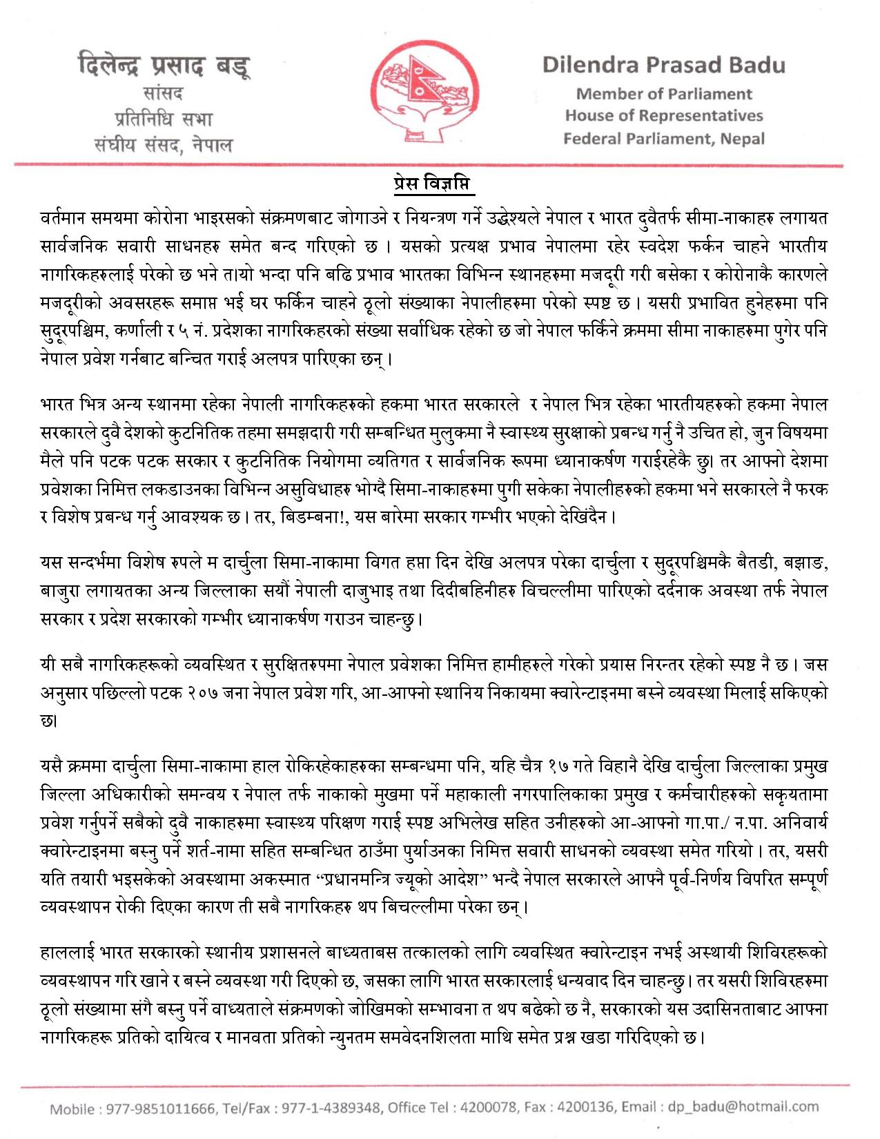 सीमामा अलपत्र नागरिककाे समस्या सामाधानका लागि छाया गृहमन्त्री बडूद्वारा सरकारको ध्यानाकर्षण (विज्ञप्ति सहित)