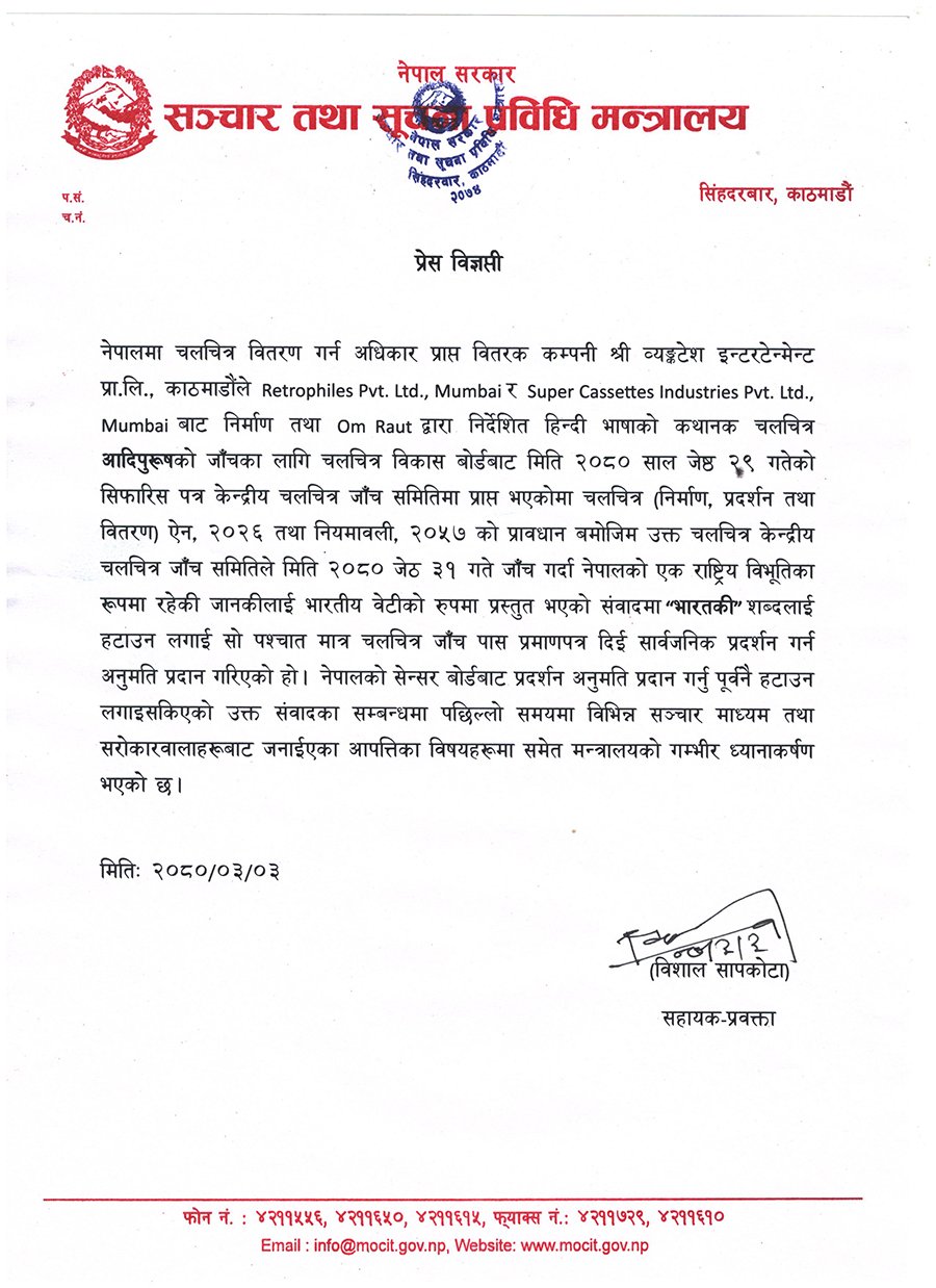 ‘आदिपुरुष’ विवादमा काठमाडौं महानगरपालिकाले सोमबारदेखि महानगर क्षेत्रभित्र भारतीय फिल्मलाई निषेध गर्ने तयारी गरेको पृष्ठभूमिमा सरकारले विज्ञप्ति जारी गरेको हो । ओम राउत निर्देशित दक्षिण भारतीय फिल्म ‘आदिपुरुष’मा प्रयुक्त उक्त संवादलाई हटाएर सेन्सर बोर्डले प्रदर्शन अनुमति दिइसकेको छ । तर काठमाडौंका मेयर बालेन्द्र शाहले चाहिं भारतमा नसच्चाएसम्म काठमाडौं महानगरभित्रका हलमा प्रदर्शनमा रोक लगाउने घोषणा गरेका छन् ।