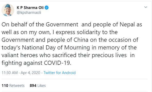 कोरोना भाइरसको सामना गर्दागर्दै दिवङ्गत चिनियाँ नागरिकप्रति श्रद्धाञ्जलि र शोकाकूल परिवारजनमा सहानभूति एवं समवेदना प्रकट गर्न चीन सरकारले शनिबार आयोजना गरेको राष्ट्रिय शोक दिवसका सन्दर्भमा प्रधानमन्त्री ओलीले सामाजिक सञ्जालमार्फत नेपाल सरकार, नेपाली जनता र आफ्ना तर्फबाट चीनप्रति ऐक्यबद्धता जनाउनुभएको हो ।