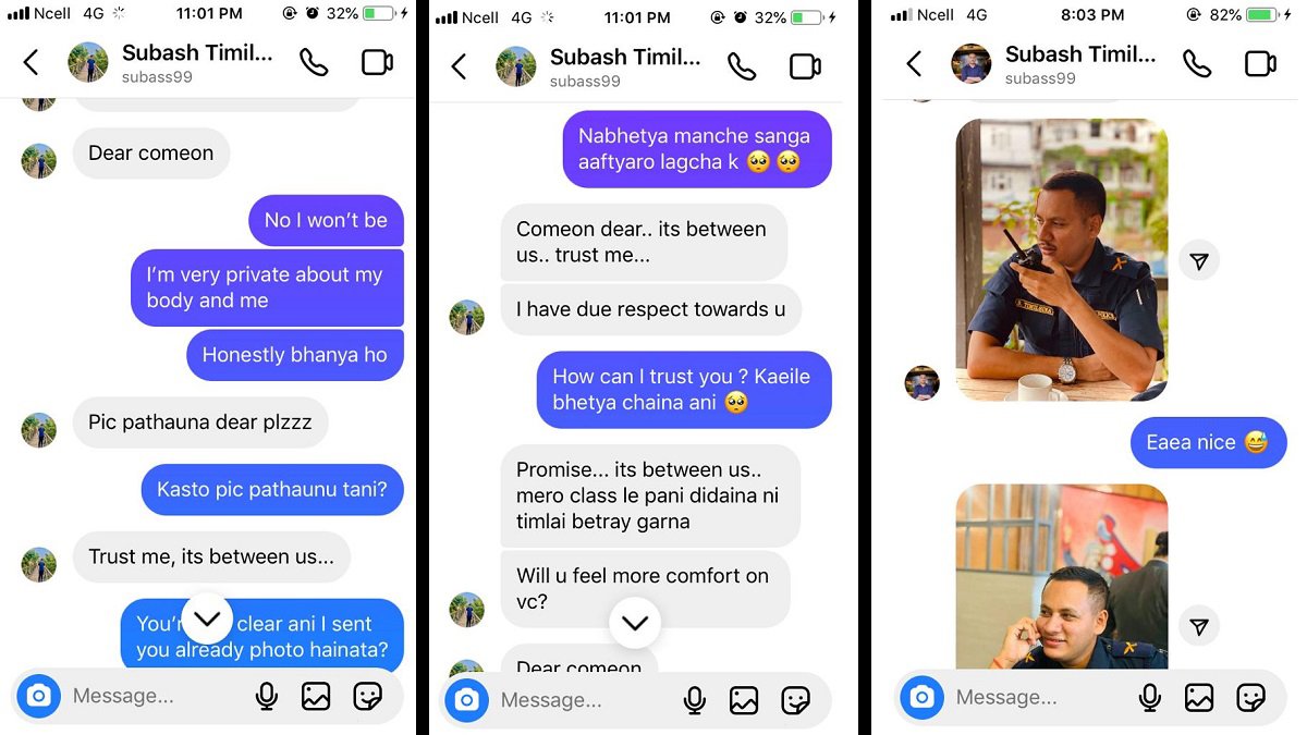पीडित महिलाले लेखेकी छिन्– ‘नेपाल प्रहरीको शक्तिमार्फत सुरक्षा सेवकले नै महिलामा असुरक्षा सिर्जना गरिरहेका छन्।’ उनले पोष्ट गरेको स्क्रिनसटमा तिमिल्सिनाले आफु ती महिला प्रहरीको शरीरको फ्यान भएको, फोटो पठाउन अनुरोध गरेका लगायत म्यासेज छन्।
