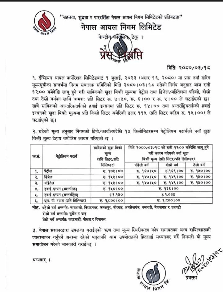 बैठकको निर्णयअनुसार साबिकको खुद्रा बिक्री मूल्यमा पेट्रोल तथा डिजेल / मट्टितेलमा पहिलो, दोस्रो तथा तेस्रो वर्गका लागि क्रमशः प्रति लिटर रु. ७.५०, रु.६ र रु. ५ ले घटाइएको छ । साथै साबिकको आन्तरिकतर्फको हवाई इन्धनमा प्रति लिटर रु. १४ तथा अन्तर्राष्ट्रियतर्फको हवाई इन्धनको खुद्रा बिक्री मूल्यमा प्रति किलो लिटर अमेरिकी डलर ११५ (प्रति लिटर करिब रु. १५००) ले घटाइएको छ । एलपी ग्यासको मूल्य भने यथावत रहेको छ ।