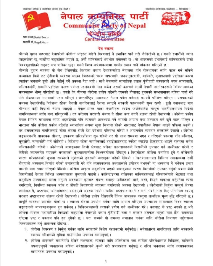 ‘कोरोना आशंकामा निजी क्षेत्रबाट चलेका अस्पतालहरुले बिरामीको उपचार गर्न अस्वीकार गरेको र केहीको ज्यान समेत गएकाले सरकारको सूचनाप्रणालीमा विश्वसनीयता देखिएन’, विप्लवको विज्ञप्तिमा भनिएको छ, ‘बिरामीहरु कोरोना प्रभावित हुने र कोरोनाकै कारण मरेकाहरुको सूचना सरकारले लुकाएको हुनसक्ने आशंका बढेको देखियो ।’