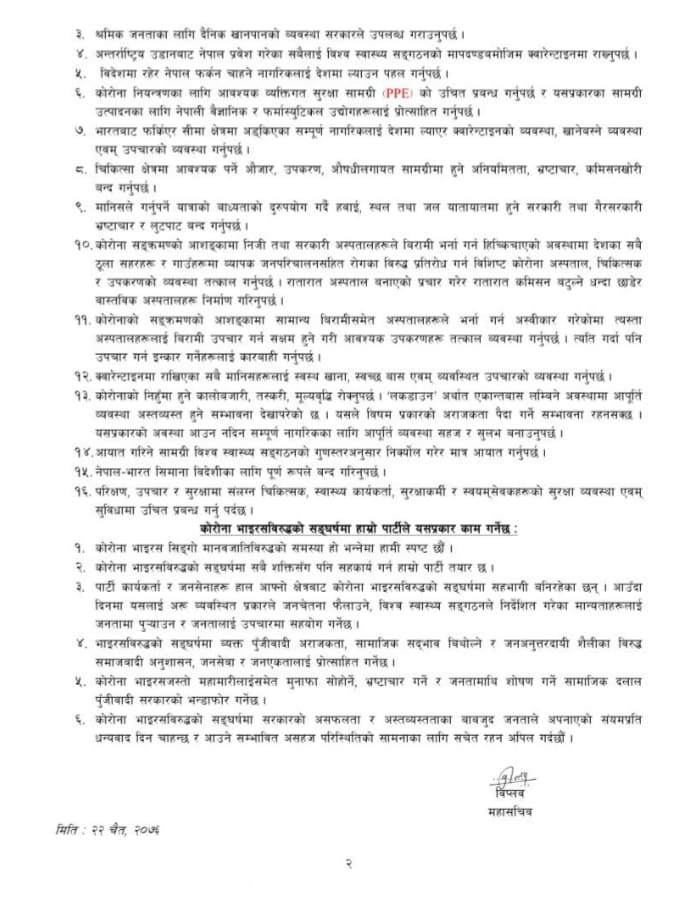 यस्तै कोरोना भाइरसविरुद्धको संघर्षमा पार्टीले खेल्ने भूमिकाबारे पनि ६ बुँदामा उल्लेख गरेका छन् ।