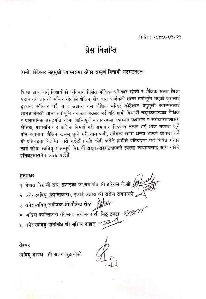 ‘हामी विद्यार्थी सङ्गठनहरूका शैक्षिक र प्रशासनिक असहमति रहेमा शान्तिपूर्ण वातावरणमा क्याम्पस प्रशासन र सरोकारवालासँग शैक्षिक, प्रशासनिक र प्राज्ञिक विमर्श गरी समाधान निकाल्न तत्पर भई आज उप्रान्त कुनै पनि बहानामा शैक्षिक खलल पुग्ने गरी तालाबन्दी, सदैवका लागि अन्त्य भएको घोषणा गर्दै यो प्रतिबद्धता विज्ञप्ति जारी गर्दछौं,’– स्ववियू अध्यक्ष सञ्जय बुढाथोकीको रोहबरमा विद्यार्थी संगठनले हस्ताक्षर गरेको प्रतिबद्धता पत्रमा भनिएको छ ।