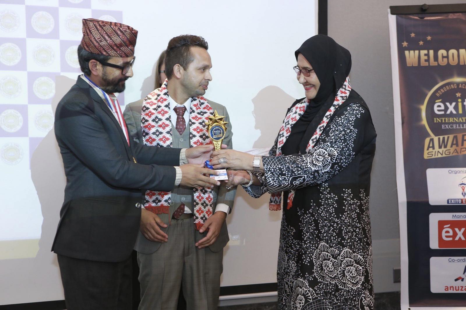 सिङ्गापुरमा आयोजित विशेष कार्यक्रममा प्रमुख अतिथि रहेका लिंकन युनिभर्सिटीका प्रो. चान्सलर प्रोफेसर दातुक डाक्टर हज्जा बीबी फेलिरना अब्दुलहा र एक्जिटो एजुकेसनका निर्देशक सचेत वीदीजनले संयुक्त रुपमा अवार्ड प्रदान गर्नुभएको थियो । नेपालभरीबाट छनोटमा परेका विभिन्न स्कुल, कलेज, तथा स्कुल सन्चालक तथा प्रिन्सिपलहरुलाई शिक्षा क्षेत्रको विकासमा पुर्याएको योगदानको कदर गर्दै अवार्ड प्रदान गरेको हो ।