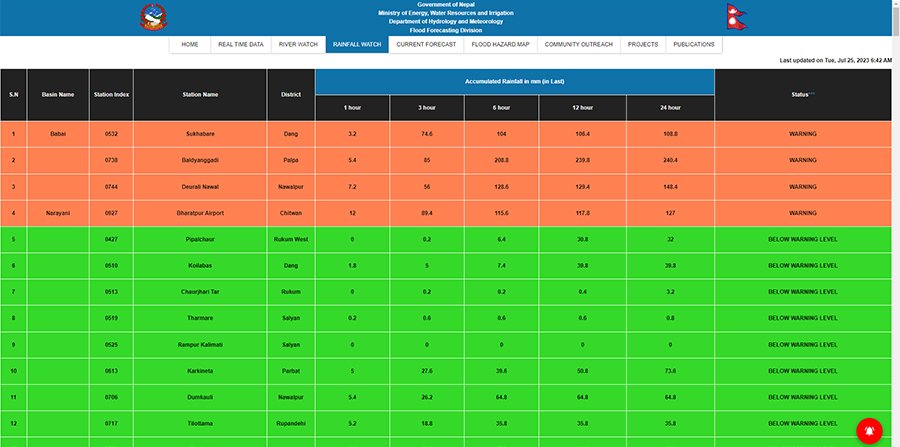 तिनाउको बाढी बढ्दो क्रममा छ । त्यसैले तिनाउ नदीका तटीय क्षेत्र र आसपास डुबान हुन सक्ने खतरा छ । विभागले होचा स्थानमा हुनेहरूलाई दिउँसो १२ बजेसम्म सुरक्षित स्थानमा रहन सूचना प्रवाह गरेको छ । यसैगरी नवलपरासीको देउराली र आसपासको क्षेत्रमा पनि भारी वर्षा मापन भएको छ । वर्षाका कारण विनयी लगायत साना खोलाहरूको बहाव बढ्ने सम्भावना छ । नदी तटीय क्षेत्रमा बसोबास गर्ने तथा यात्रामा निस्किनेहरूलाई सतर्कता अपनाउन जल तथा मौसम विज्ञान विभागले अनुरोध गरेको छ । जल तथा मौसम विज्ञान विभागको बाढी पूर्वानुमान महाशाखाका अनुसार चितवनको भरतपुर एयरपोर्ट र दाङको बबई नदी बेसिनको सुखबारे भन्ने स्थानमा पनि अत्यधिक वर्षा मापन भएको छ ।