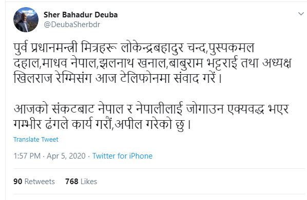 आइतबार देउवाले पुष्पकमल दाहाल ‘प्रचण्ड’, लोकेन्द्रबहादुर चन्द, माधवकुमार नेपाल, झलनाथ खनाल, डा. बाबुराम भट्टराई र मन्त्रिपरिषद अध्यक्ष खिलराज रेग्मीलाई टेलिफोन गरेको जानकारी ट्वीटरमार्फत् दिएका छन् ।
