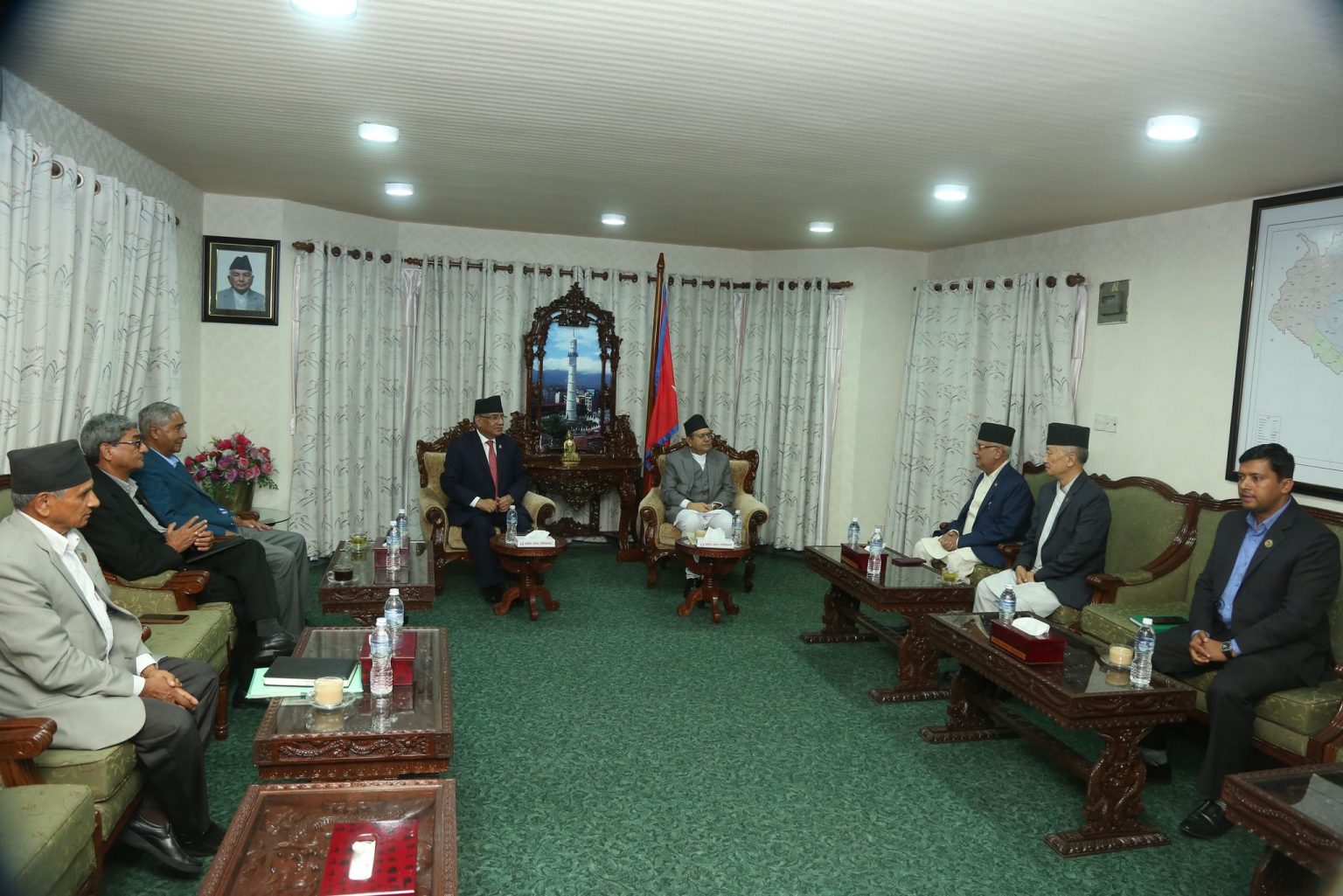तीन ठूला दलका शीर्ष नेताहरुसहित प्रमुख सचेतक तथा सचेतकहरु पनि बैठकमा हुनुहुन्छ ।