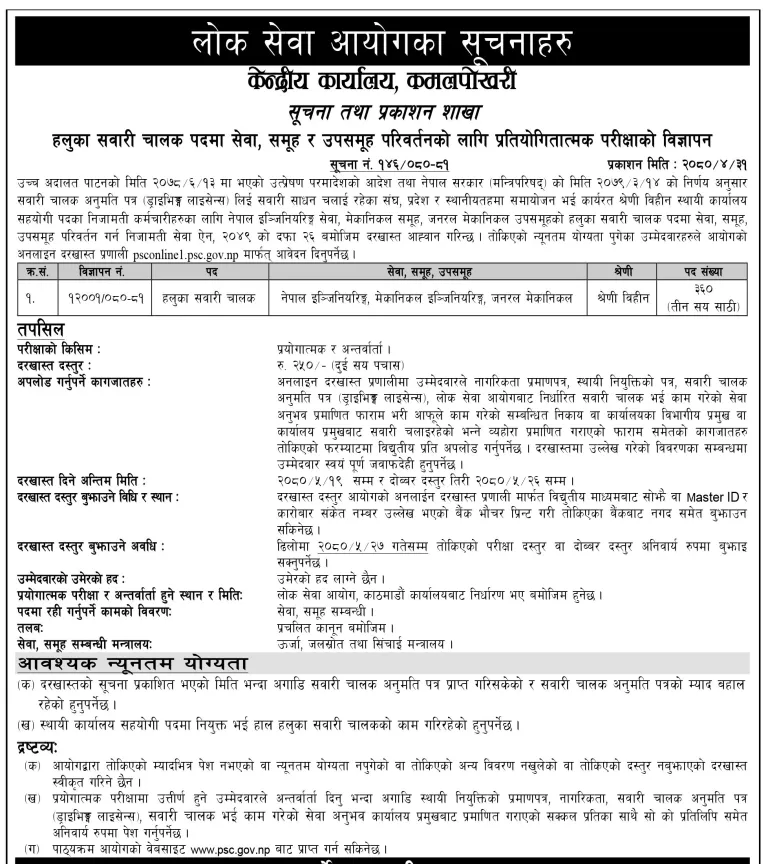 काठमाडौँ – लोक सेवा आयोगले ३६० जना हलुका सवारी चालकका लागि आवेदन आह्वान गरेको छ ।