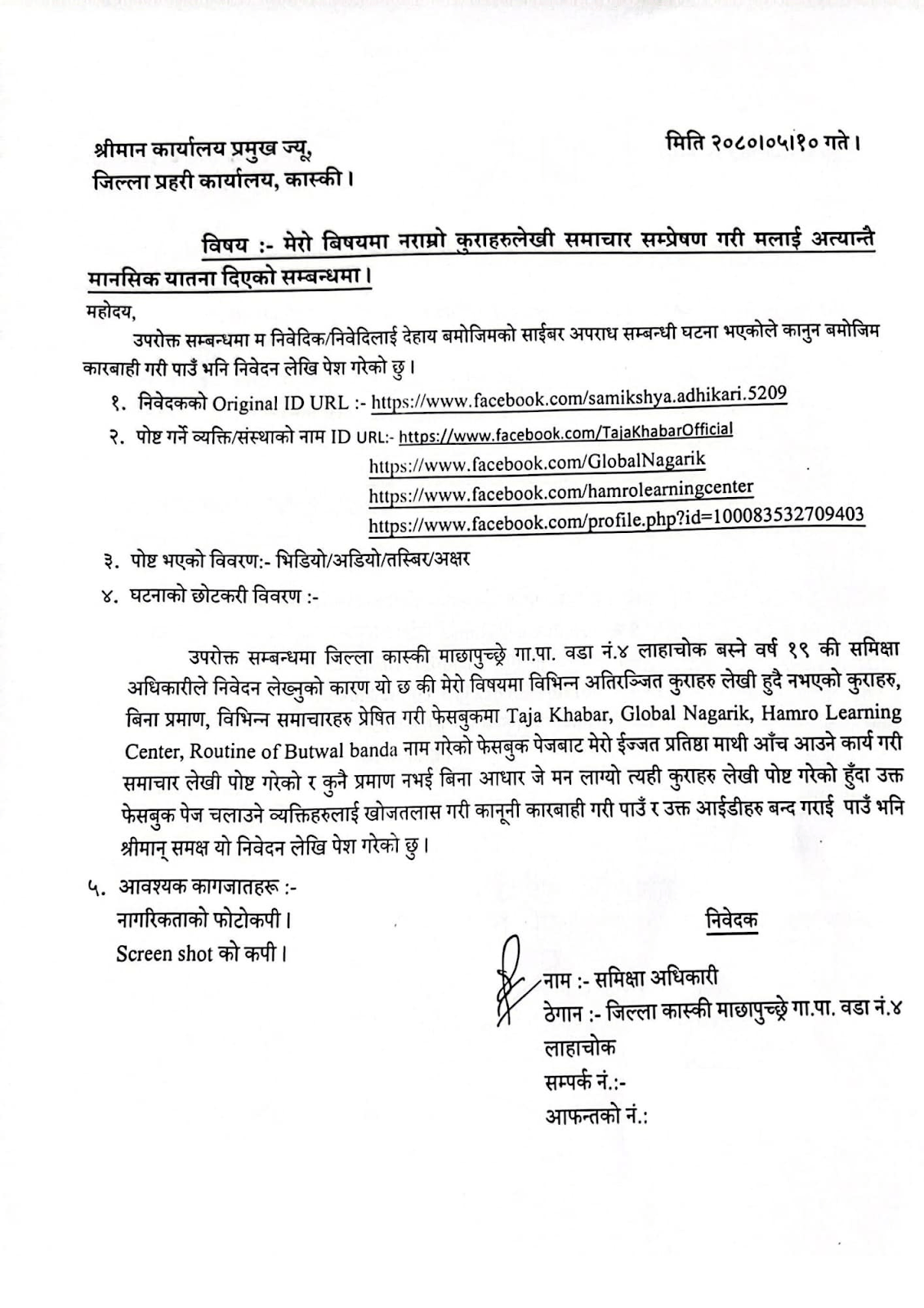 उनले सञ्चार माध्यमलाई यथार्थ बुझेर मात्र समाचार सम्प्रेषण गर्न अनुरोध गरेकी छिन् । उनले ताजा खबर, ग्लोबल नागरिक, हाम्रो लर्निङ सेन्टर र रुटिन अफ बुटवल बन्द नाम गरेका फेसबुक पेजविरुद्ध जुरी दिएको निवेदनमा उल्लेख छ । बिना कुनै प्रमाण जे मन लाग्यो त्यही लेखी पोस्ट गरेकाले ती फेसबुक पेज बन्द गराइदिन भन्दै अधिकारीले निवेदन पेस गरेकी छिन् ।