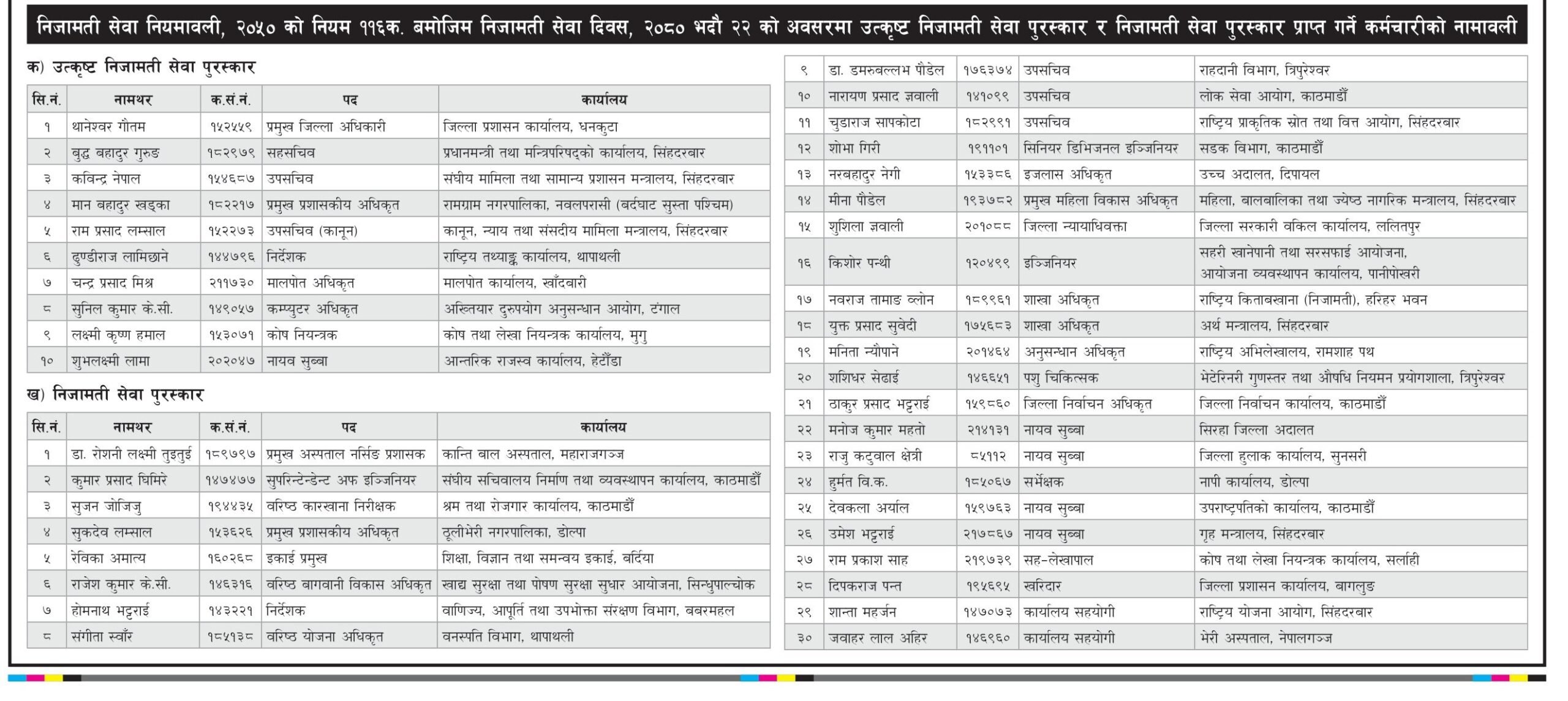 उत्कृष्ट निजामति सेवा पुरस्कार पाउनेहरुमा धनकुटाका प्रमुख जिल्ला अधिकारी थानेश्वर गौतम, प्रधानमन्त्री तथा मन्त्रिपरिषद्को कार्यालय सिंहरदरबारका सहसचिव बुद्ध बहादुर गुरूङ, संघीय मामिला तथा सामान्य प्रशासन मन्त्रालय सिंहदरबारका उपसचिव कविन्द्र नेपाल लगायत १० जना छन्।