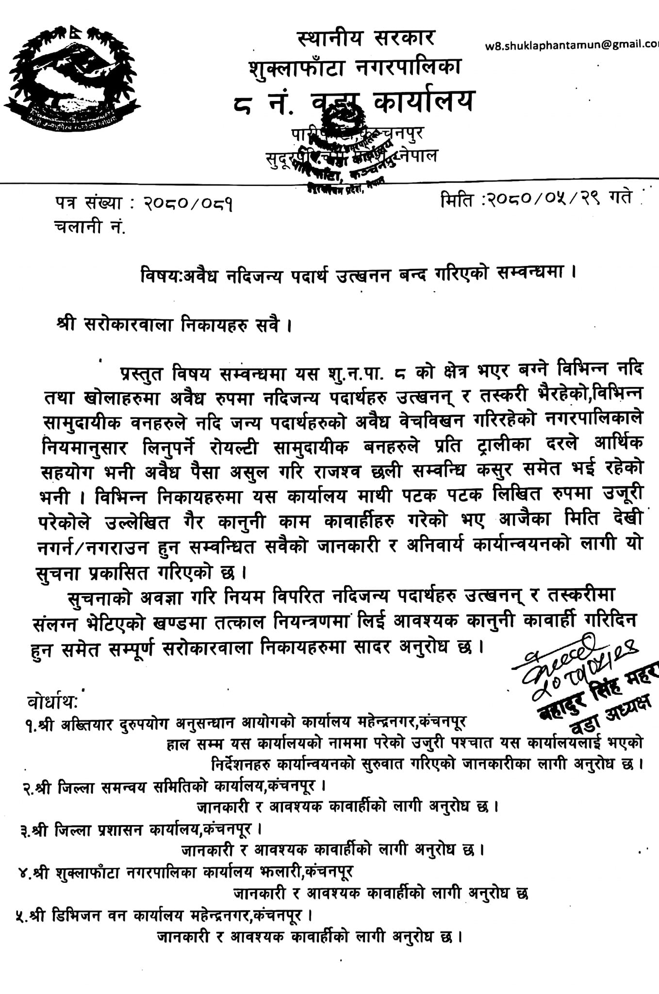 कञ्चनपुर – कञ्चनपुरको शुक्लाफाँटा नगरपालिका–८ मा अवैध नदिजन्य पदार्थ उत्खनन गर्नेलाई कारवाही गर्ने वडा अध्यक्ष बहादुर सिँह महराले बताएका छन् । उनले एक सूचना जारी गर्दै नदीजन्य पदार्थ उत्खनन कार्य बन्द भएको र सो नियम विपरित काम गरिएको पाइएको तत्काल नियन्त्रणमा लिई कानुनी कारवाही अगाडी बढाउने बताएका छन् ।