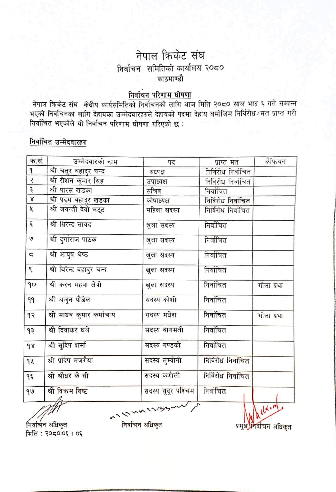 सचिव पदका लागि भने निर्वाचन भएको थियो। सचिवमा नेपाली राष्ट्रिय क्रिकेटका पूर्व कप्तान पारस खड्का निर्वाचित भएका हुन्। उनले प्रशान्तबिक्रम मल्ललाई पछि पारेका हुन्। पारस खड्काले ४८ मत पाउँदा प्रशान्तविक्रम मल्लले ३७ मत पाएका थिए। कुल ८५ मत खसेको थियो। यस्तै कोषाध्यक्षमा पदमबहादुर खड्का र महिला सदस्यमा जयन्तीदेवी भट्ट पनि निर्विरोध निर्वाचित भएका छन्।
