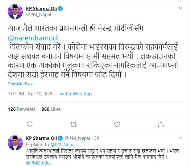 शुक्रबार प्रधानमन्त्री ओली र भारतीय समकक्षी मोदीबीच कोरोना भाइरसविद्धको सहकार्यलाई अझ सशक्त बनाउँदै एक अर्काको मुलुकमा लकडाउनका कारण रोकिएका नागरिकलाई आ–आफ्नो देशमा राम्रो हेरचाह गर्ने विषयमा संवाद भएको छ ।
