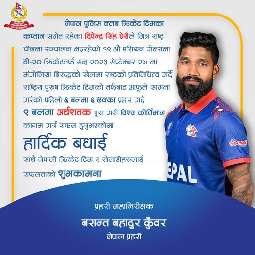 प्रहरी महानिरीक्षक बसन्त बहादुर कुँवरले नेपाल प्रहरीको तर्फबाट कप्तान ऐरीलाई हार्दिक बधाई दिनुको साथै नेपाली क्रिकेट टीम र खेलाडीहरूमा सफलताको शुभकामना व्यक्त गर्नुभएको छ ।