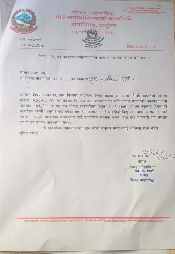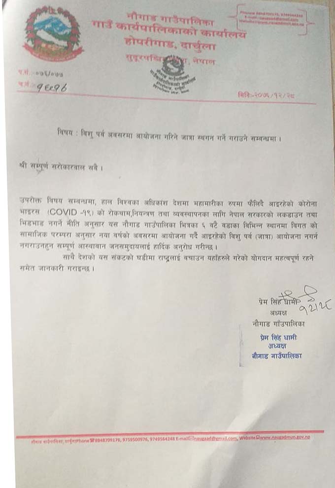 हाल विश्वका अधिकांश देशमा महामारकिा रुपमा फैलिदै आइरहेको कोरोना भाइरस (कोभिड–१९)को रोकथाम, नियन्त्रण तथा व्यवथापनका लागि नेपाल सरकारको लकडाउन तथा भीडभाड नगर्ने नीति अनुसार यस नौगाड गाउँपालिका भित्रका ६ वटै विभिन्न स्थानमा विगतको सामाजिक परम्परा अुनसार नयाँ वर्षको अवसरमा आयोजना गर्दै आइरहेको विशु पर्व (जात्रा) आयोजना नगर्न नगराउन सम्पूर्ण आस्थावान जनसमुदायलाई सार्वजनिक स्थानमा सूचना टाँस गरी जानकारी गर्न गराउन हुन यो पत्र मार्फत जानकारी गरिन्छ । साथै सार्वजनिक स्थानमा सूचना टाँस गरेको मुचुल्का समेत बनाइ अभिलेख राख्न सूचित गरिन्छ । गाउँपालिका अधयक्ष प्रेम सिंह धामीद्वारा हस्ताक्षरित सूचनामा लेखिएको छ ।