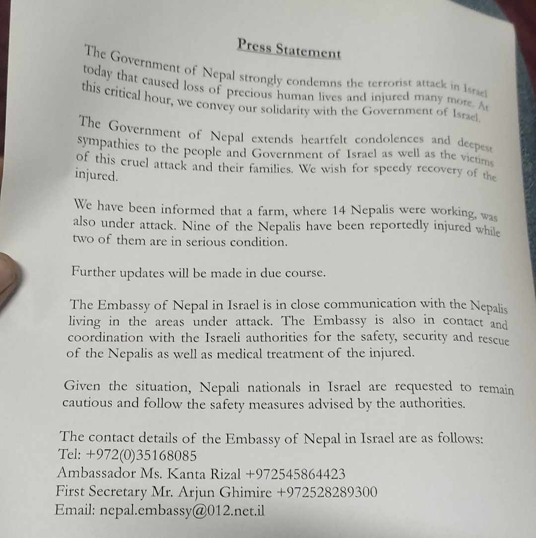 काठमाडौँ – इजरायलमा शनिबार बिहान भएको हमास विद्रोहीहरुको हमलामा परेर ९ जना नेपाली घाइते भएको परराष्ट्र मन्त्रालयले जानकारी दिएको छ । घाइते मध्ये दुईजनाको अवस्था गम्भीर रहेको मन्त्रालयले जानकारी दिएको हो ।