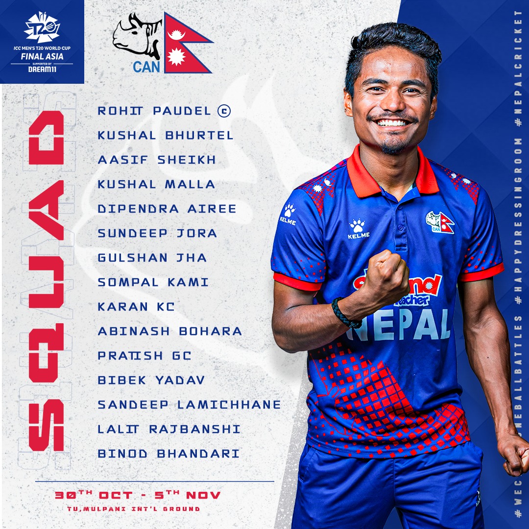 जसअनुसार कप्तान रोहित पौडेलको नेतृत्वको नेपाली टिममा कुशल भुर्तेल, आशिफ शेख, कुशल मल्ल, दिपेन्द्रसिंह ऐरी, सन्दीप जोरा, गुल्शन झा, सोमपाल कामी, करण केसी, अभिनाश बोहरा, प्रतिश जिसी, विवेक यादव, सन्दीप लामिछाने, ललित राजवंशी र विनोद भण्डारी परेका छन्।