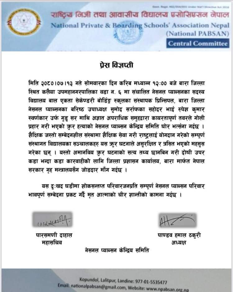 संस्थाका केन्द्रीय अध्यक्ष पाण्डव हमाल ठकुरी र महासचिव पारसमणि दाहालले संयुक्त रूपमा जारी गरि शिक्षक हत्यामा संलग्नलाई कडा भन्दा कडा कारबाहीको माग गरेको हो । विज्ञप्ति मार्फत नेसनल प्याब्सन सदस्य विद्यालय बाल एकता सेकेण्डरी बोर्डिङ स्कुलका संस्थापक प्रिन्सिपल, बारा जिल्ला नेसनल प्याब्सनका वरिष्ठ उपाध्यक्ष सुमोद सर्राफका सहोदर भाइ रुपेश कुमार स्वर्णकार उर्फ गुडु सर माथि अज्ञात आपराधिक समूहद्वारा कायरतापूर्ण तवरले गोली प्रहार गरी भएको क्रूर हत्याको घोर भर्त्सना गरिएको छ। यस घटनाले सम्पूर्ण संस्थागत विद्यालयका सञ्चालकहरू असुरक्षित र त्रसित भएको विज्ञप्तिमा उल्लेख छ।