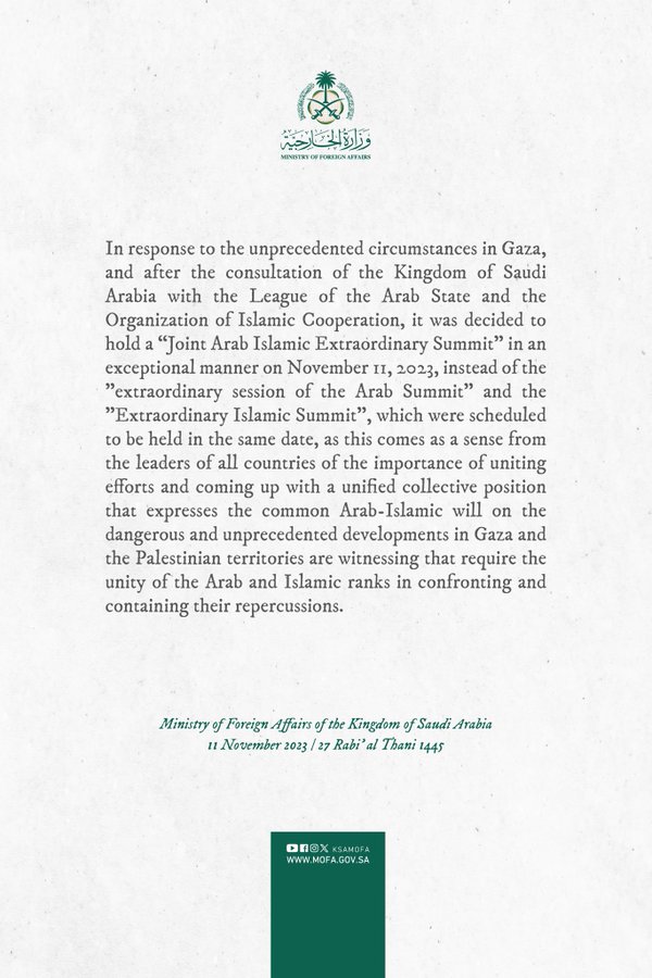 साउदी अरेबियाले सुरुमा शनिबार अरब र इस्लामिक शिखर सम्मेलनहरू छुट्टाछुट्टै आयोजना गर्न लागेको थियो तर अरब राष्ट्रहरूको लिग र इस्लामिक सहयोग संगठनसँगको परामर्शपछि दुवैलाई संयोजन गर्ने निर्णय गरेको हो ।