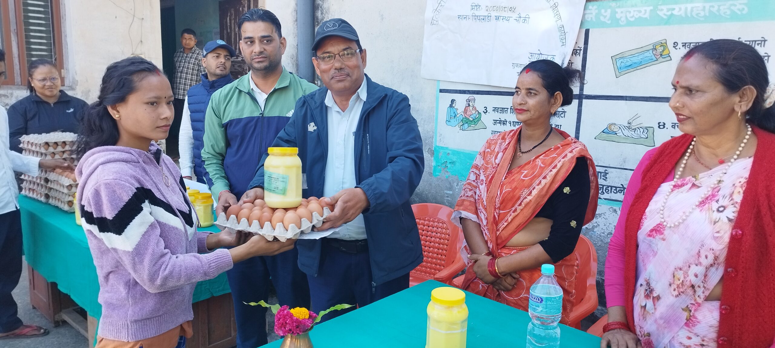 नगरपालिकाले नगरभित्रका स्वास्थ्य संस्थाबाट सेवा लिएका सुत्केरी महिलाहरूलाई पाेषण सामाग्री वितरण गर्दै आएकाे छ । जसअन्तर्गत आज पिपलाडी स्वास्थ्य चौकीमा प्रतेक सुत्केरी महिलालाइ एक क्रेट अण्डा र एक केजी घ्यू वितरण गरिएको हो ।