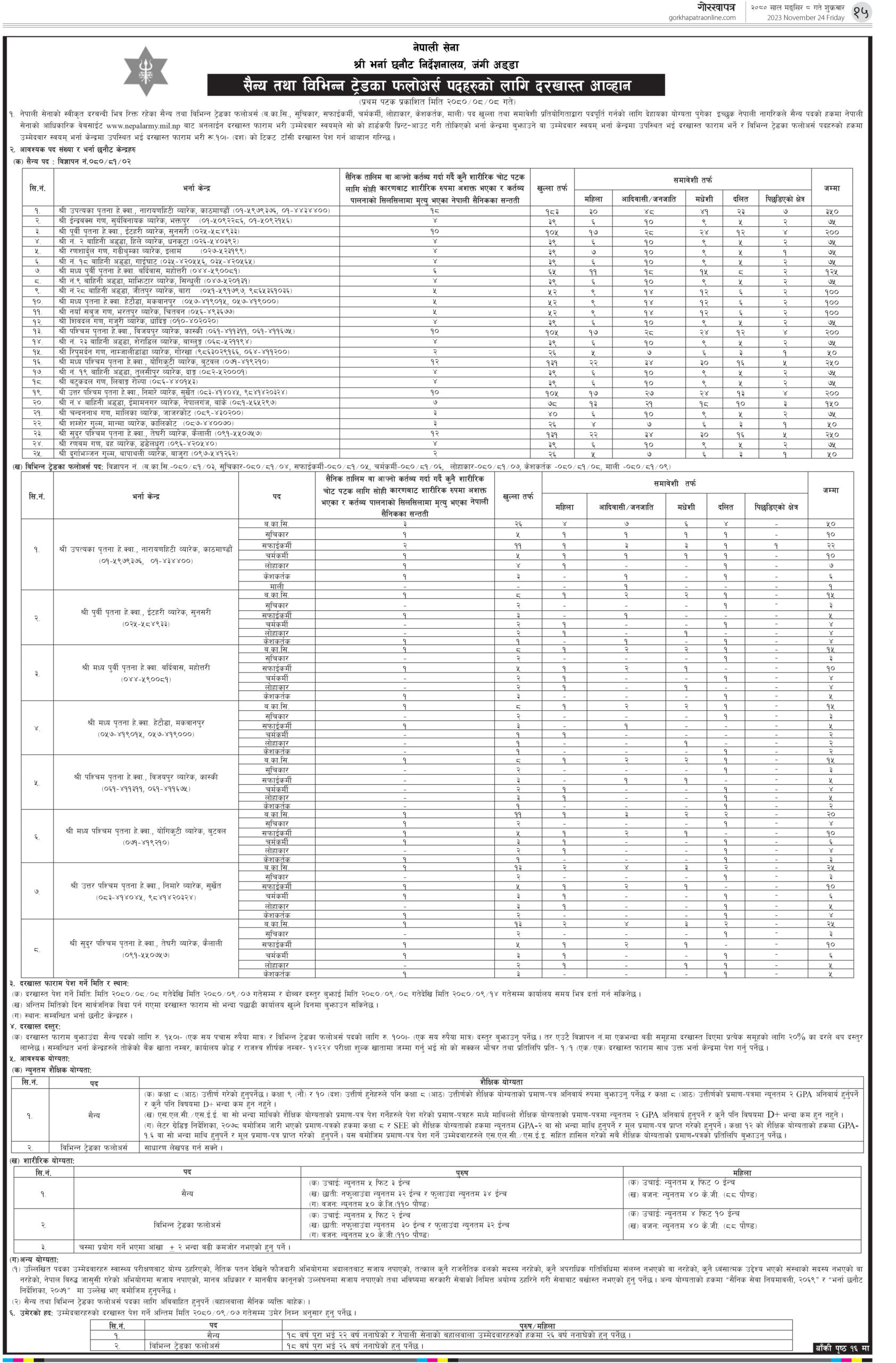 सैन्य पदमा ३ हजार र सूचिकार, सफाइकर्मी, चर्मकर्मी, लोहाकार, केशकर्तक, माली लगायतका पदमा ४१३ जना नयाँ कर्मचारी भर्नाको लागि दरखास्त आह्वान गरिएको नेपाली सेनाको भर्ना छनोट निर्देशनालयले जनाएको छ।