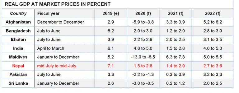 विश्व बैंकको ‘साउथ एसिया इकोनोमिक फोकस’ रिपोर्ट अनुसार यो वर्ष आर्थिक वृद्धिदर एक दशमलव ५ देखि दुई दशमलव ८ प्रतिशतका बीचमा रहने र सन् २०२१ मा १ दशमलव ४ देखि दुई दशमलव ९ प्रतिशतको बीचमा रहनेछ ।