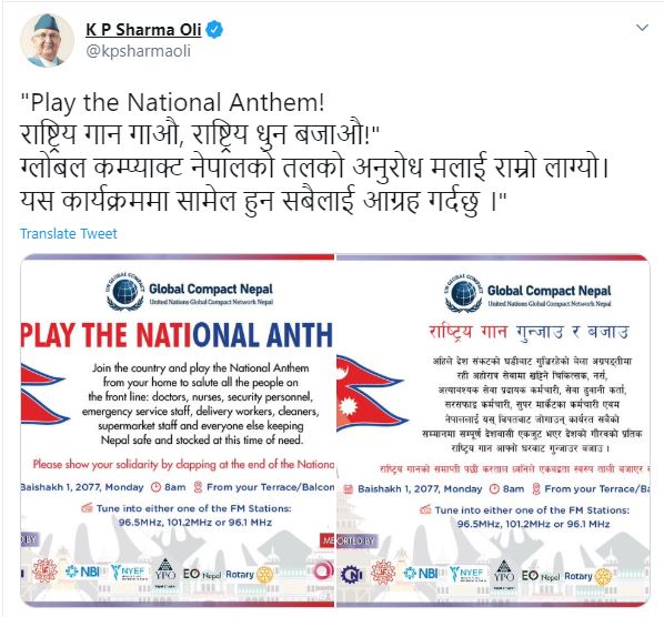 काठमाडौं – प्रधानमन्त्री केपी शर्मा ओलीले चिकिसत्क, नर्स तथा अत्यावश्यक सेवामा खटिएकाहरुको सम्मानमा भोलि राष्ट्रिय गान गाउन र ताली बजाउन आह्वान गरेका छन् ।