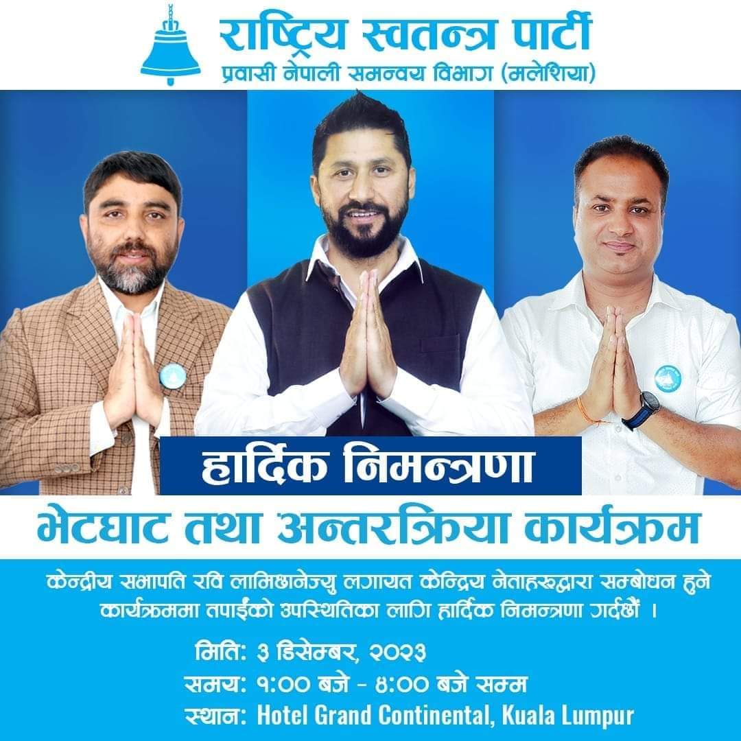 काठमाडौं, १५ मंशिर । राष्ट्रिय स्वतन्त्र पार्टीका सभापति रवि लामिछाने मलेसियाँ जादैँछन् ।