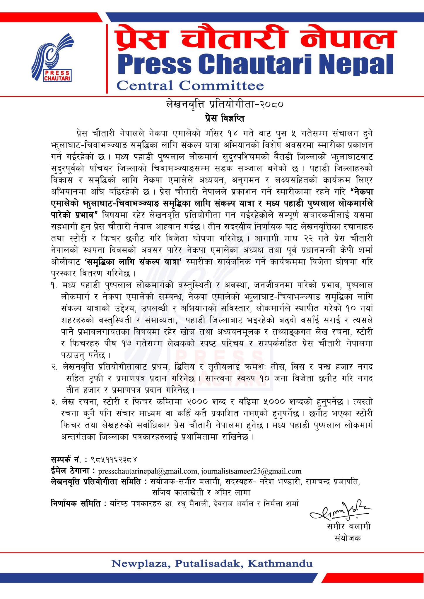 मंगलवार प्रेस विज्ञप्ति जारी गर्दै पौष १७ गते भित्र “नेकपा एमालेको झुलाघाट–चिवाभञ्ज्याङ समृद्धिका लागि संकल्प यात्रा र मध्य पहाडी पुष्पलाल लोकमार्गले पारेको प्रभाव” विषयमा रहेर स्टोरी र फिचर लेखि प्रेस चौतारी नेपालको इमेल आईडी [email protected][email protected] मा पठाउन आह्वान गरेको छ । साथै ९८५११६२३८४ नं. को भाईवर वा वाट्सएपमा समेत लेख पठाउन सकिने प्रेस चौतारीले जनाएको छ । प्रतियोगिताको लागि डा. रघु मैनालीको संयोजकत्वमा देवराज आर्यल र निर्मला शर्मा रहेको तीन सदस्यीय निर्णायक समिति गठन गरेको विज्ञप्तिमा उल्लेख छ ।