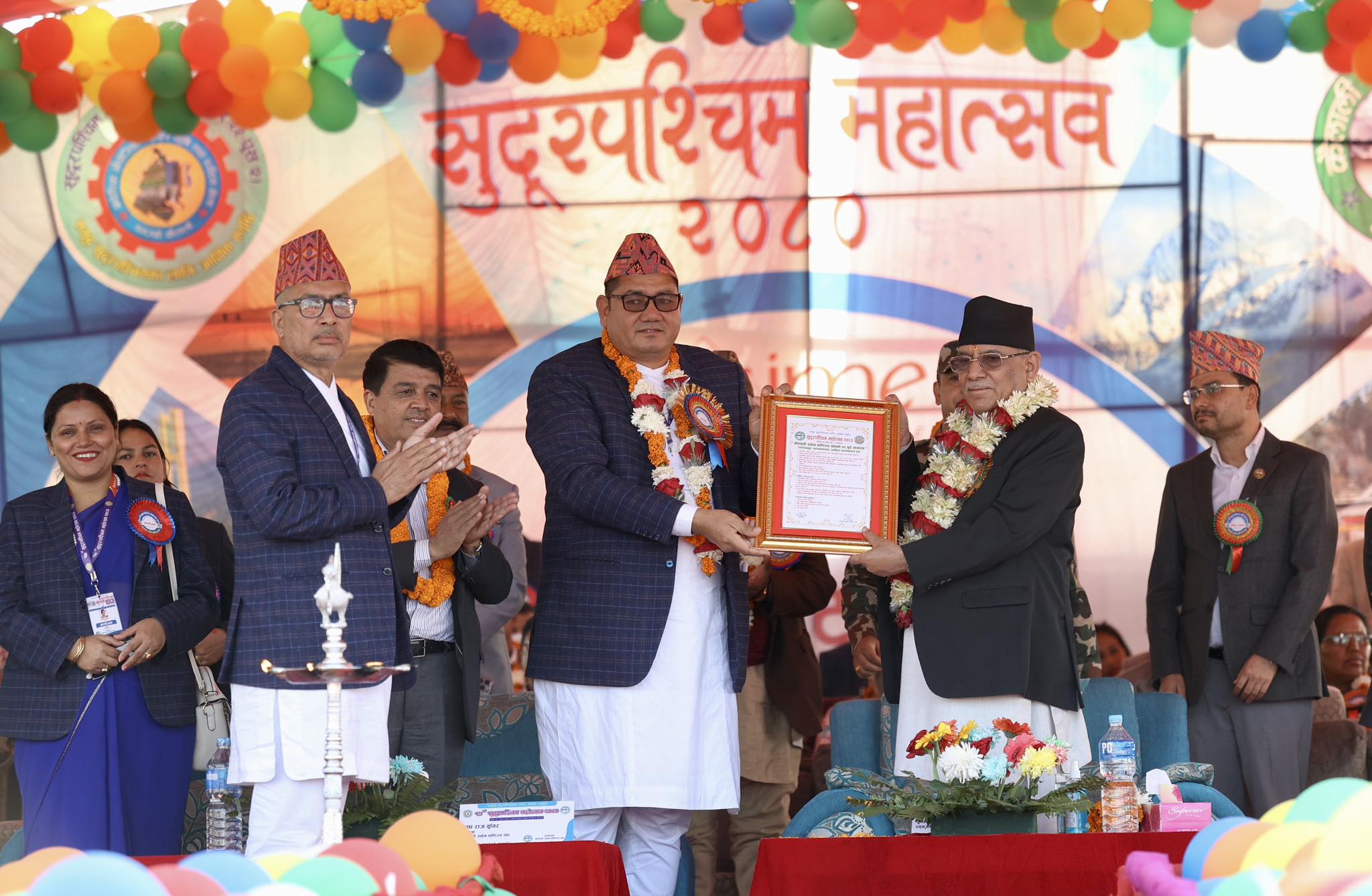 कैलाली उद्योग वाणिज्य संघको आयोजनामा धनगढी उपमहानगरपालिका–१ मा सुरु भएको सुदूरपश्चिम महोत्सवको उद्घाटना समारोहमा माओवादी केन्द्रका अध्यक्ष तथा प्रधानमन्त्री दाहाललाई १० किलोको माला लगाइएको हो।