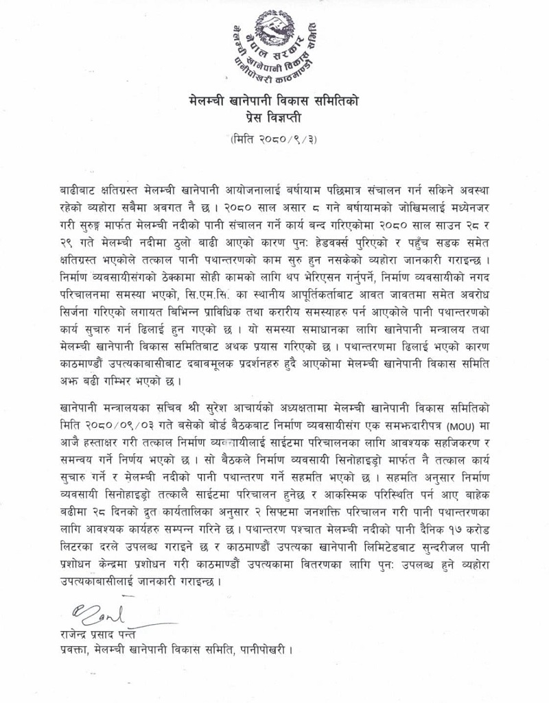 सहमति अनुसार निर्माण व्यवसायी सिनोहाइड्रो तत्कालै साइटमा परिचालन हुनेछ र दुई सिफ्टमा काम गरी बढीमा २८ दिनभित्र पानी सुरुङमा पठाउने जानकारी दिएको छ। गएको असार ८ गते वर्षायामको जोखिमलाई ध्यान दिएर सुरुङमार्फत् मेलम्ची नदीको पानी सञ्चालन गर्ने कार्य बन्द गरिएकोमा साउन २८ र २९ गते मेलम्ची नदीमा बाढी आएको कारण पुनः हेडवर्क्स पुरिएको पनि विकास समितिले बताएको छ ।