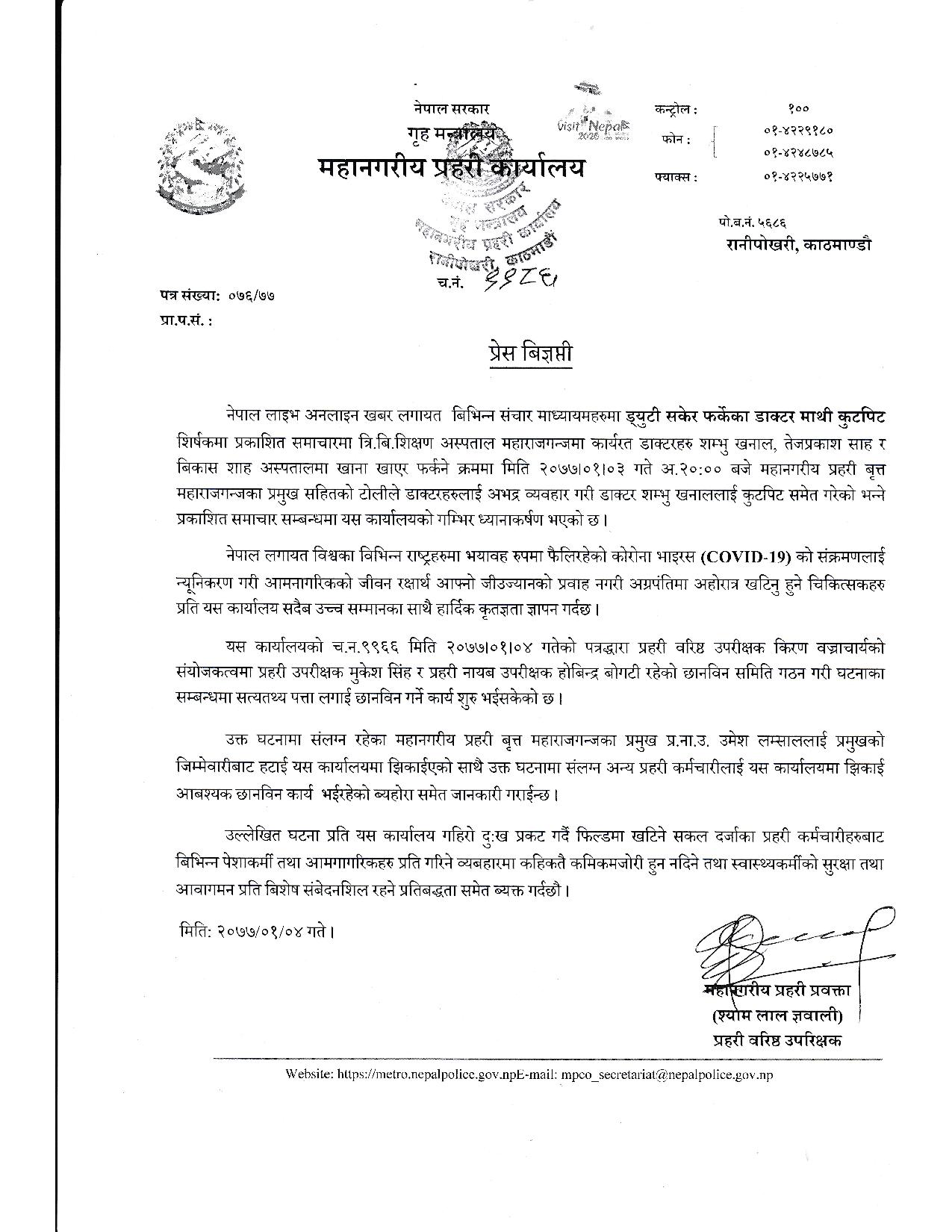 कोभिड–१९ को सङ्क्रमणलाई न्यूनीकरण गरी नागरिकको जीवन रक्षार्थ अग्रपङ्त्तिमा खटिएका चिकित्सकको उच्च सम्मान रहेको महानगरीय प्रहरी कार्यालयले जारी गरेको विज्ञप्तिमा उल्लेख छ ।