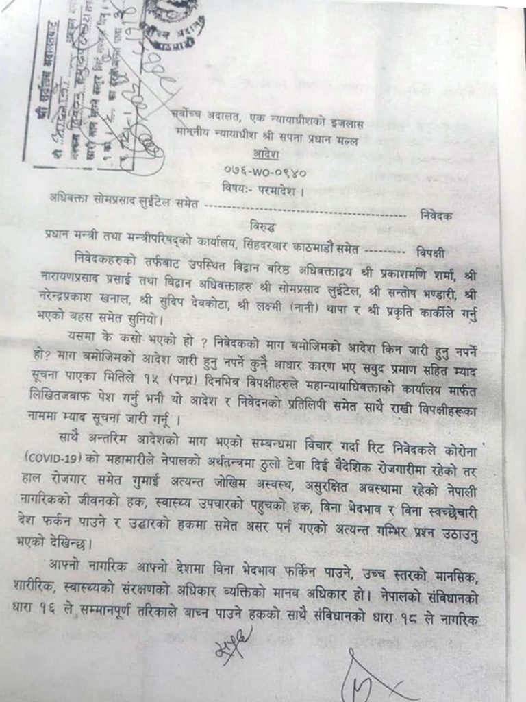 विदेशमा जोखिममा रहेकाहरु अनियन्त्रित र अव्यवस्थित रुपमा नेपाल प्रवेशबाट थप जोखिम हुने भन्दै सर्वोच्चले नागरिकलाई त्यसबाट जोगाउनका लागि नागरिकको स्वास्थ्य र सुरक्षाको हितलाई ध्यान दिँदै उद्धार गर्न आदेश दिएको छ ।