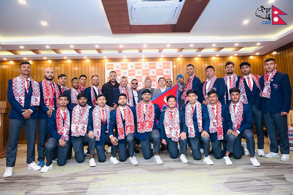 काठमाडौं, २० पुस । आईसीसी पुरुष यू- १९ विश्वकप क्रिकेट खेल्न जाने नेपाली टोलीको बिदाई गरिएको छ । नेपाल क्रिकेट संघ (क्यान) ले बिहीबार एक कार्यक्रममा नेपाली क्रिकेट टिमको बिदाई गरेको हो । नेपाली टोलीलाई राष्ट्रिय खेलकुद परिष्द (राखेप) का सदस्य सचिव टंकलाल घिसिङ, क्यानका अध्यक्ष चतुर बहादुर चन्द, सचिव पारस खड्का लगायतले बिदाई गरेका हुन् ।