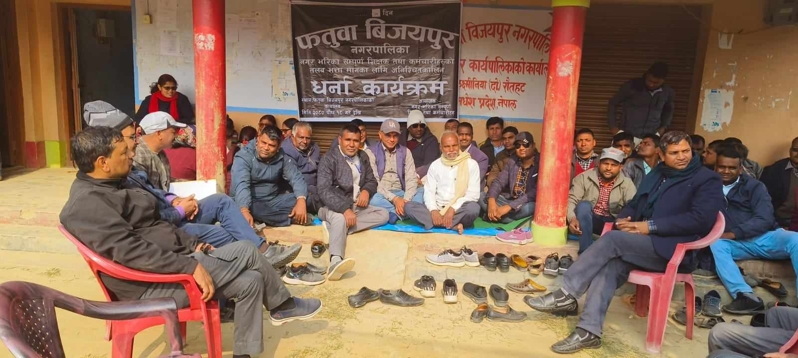 रौतहटको फतुवा विजयपुर नगरपालिकामा कार्यरत शिक्षक कर्मचारी तलबको माग गर्दै तेस्रो दिन पनि धर्नामा जारी राखेका छन्। जनप्रतिनिधिबीच आपसी विवादका कारण गत साउनदेखि तलव पाउन नसकेका शिक्षक कर्मचारी नगरपालिकाको अगाडी बुधबारदेखि धर्ना सुरु गरेका हुन्।