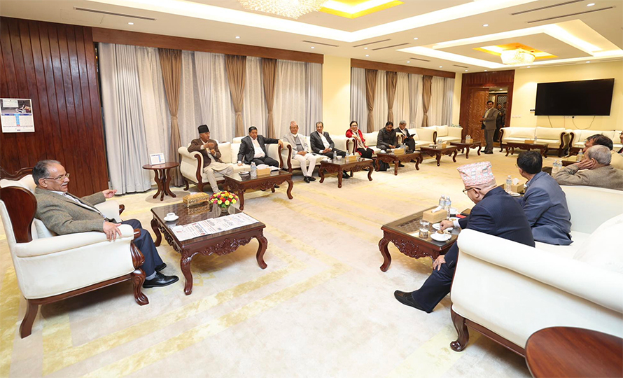 प्रधानमन्त्रीको सरकारी निवासमा नेकपा माओवादी केन्द्रसहित नेपाली कांग्रेस, जनता समाजवादी पार्टी र नेकपा एकीकृत समाजवादीका शीर्ष नेताहरु अहिले छलफलमा रहेका छन । भोली हुने राष्ट्रियसभा निर्वाचनमा उम्मेदवारी दर्ता गर्नु अघि गठबन्धन भित्रका ठुला दलले भागबन्डा टुंग्याइसक्नु पर्ने दबाबका बिचमा यो बैठक बसिरहेको हो । मुख्यतः नेकपा एसले पाउने भागबन्डाका लागि यो बैठक बसिरहेको एक नेताले जनाएका छन ।