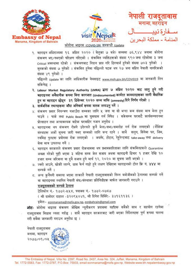 काठमाडौं – बहराइनमा थप २७ नेपालीमा कोरोना भाइरस (कोभिड–१९) को संक्रमण भएको छ । यससँगै बहराइनमा रहेका नेपालीमा कोरोना संक्रमितको संख्या ४९ पुुगेको छ ।