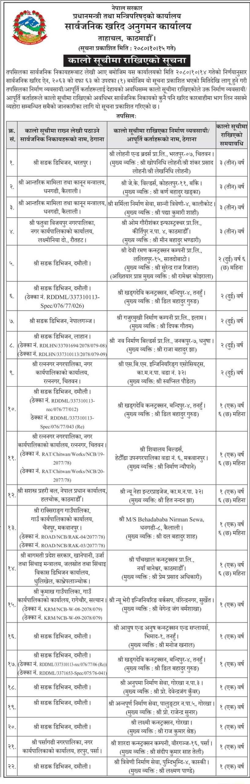 २२ ठेकेदार कम्पनी परे कालोसूचीमा