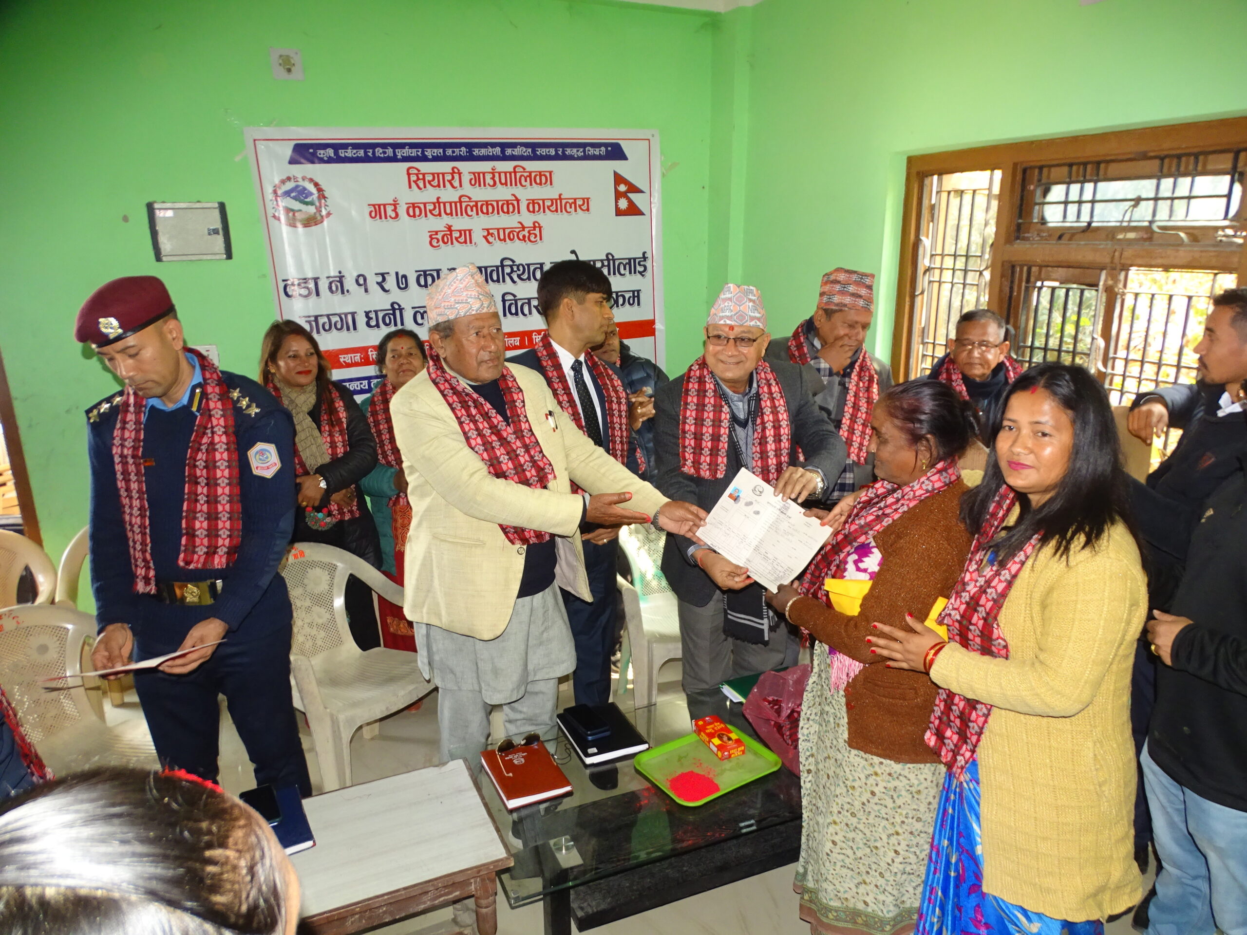 भैरहवा, १७ माघ । रुपन्देहीको सियारी गाउँपालिका वडा नम्बर १ र ७ का अव्यवस्थित बसोबासीलाई जग्गाधनी प्रमाणपूर्जा (लालपूर्जा) वितरण गरिएको छ ।