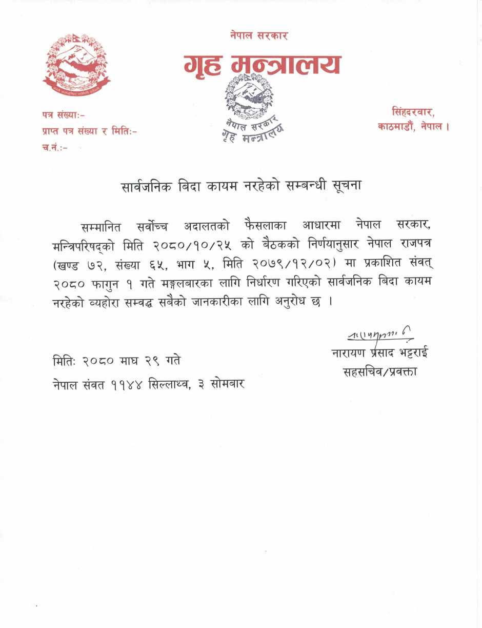‘सम्मानित सर्वोच्च अदालतको फैसलाका आधारमा नेपाल मन्त्रिपरिषद्को मिति २०८०÷१०÷२५ को बैठकको निर्णयानुसार नेपाल राजपत्र (खण्ड ७२, संख्या ६५, भाग ५ मिति २०७९÷१२÷०२) मा प्रकाशित संवत् २०८० फागुन १ गते मङ्गलबारका लागि निर्धारण गरिएको सार्वजनिक बिदा कायम नरहेको व्यहोरा सम्वद्ध सबैको जानकारीका लागि अनुरोध छ,’ सोमबार गृहमन्त्रालयका प्रवक्ता नारायण प्रसाद भट्टराईले जारी गरेको विज्ञप्तिमा उल्लेख छ ।